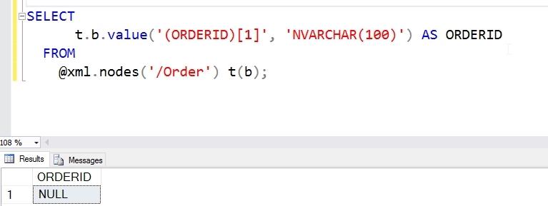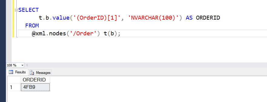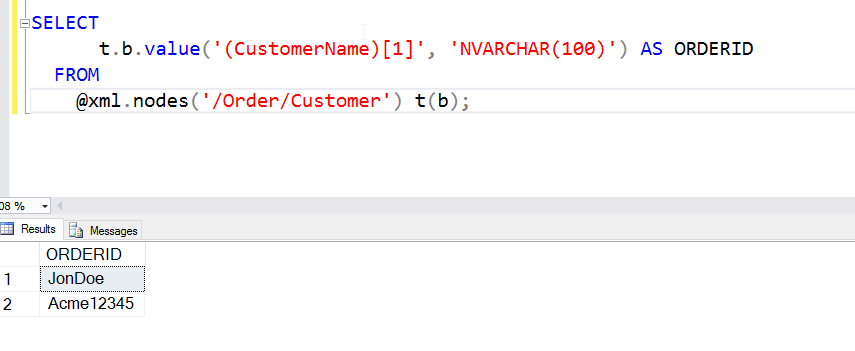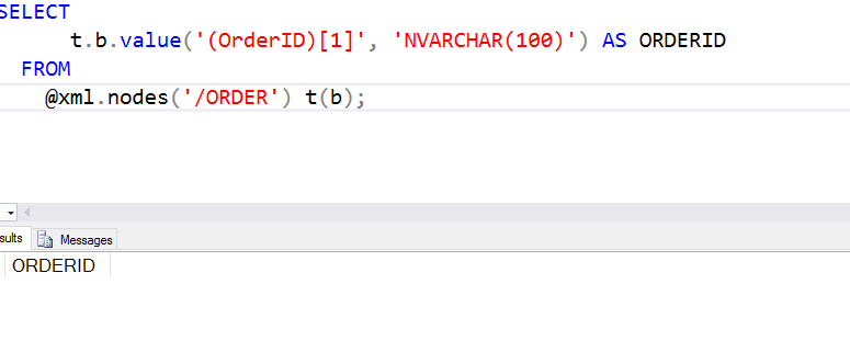 t.b.value(‘(ORDERID)[1]’, ‘NVARCHAR(100)’) AS MSGID