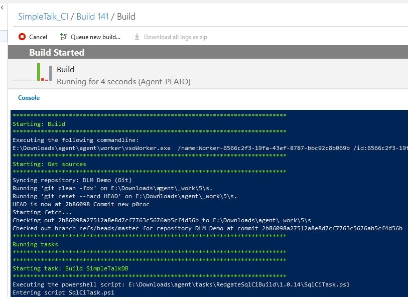 I can also trigger a build. I happen to have one setup for a project that points to local instances. Here’s the build definition, which uses the VSTS Extension from Redgate to build a database.