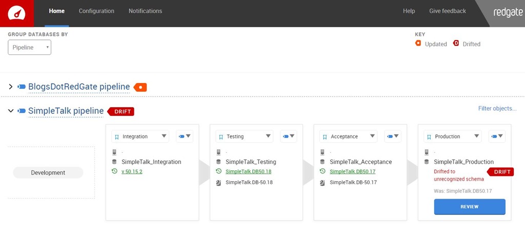 Once that’s installed, you can add the various databases that make up your pipeline for monitoring. For example, I’ve got a SimpleTalk pipeline with four databases in my environments, as shown here: