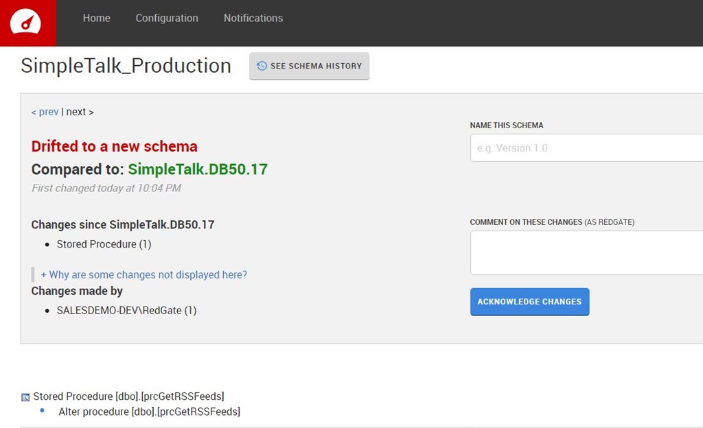 This is a new version of my procedure on production (note the RED outline, thanks SQL Prompt). I have drift. My schema is not in the same state as it was. Production now has a red note, with the drift image.