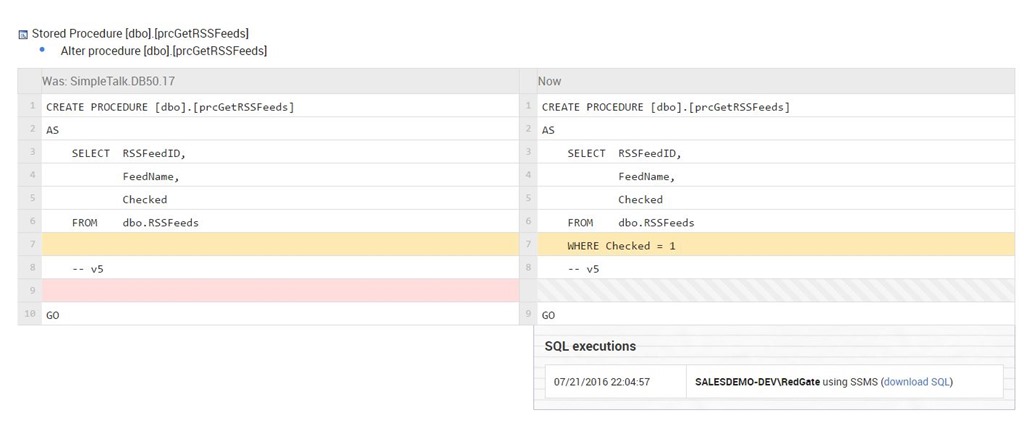 Scrolling down I can see the actual code that changed. Using the style that SQL Compare and other tools use, I see the additions to the code highlighted, showing what was in the previous version as well.