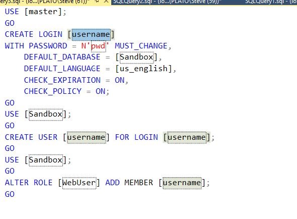 This is all custom code I put into my Snippet Manager. I can now replace these parameters with new values, or just execute this code as is to create a new login and user. Note I typed three things (c, l, TAB) to get lots of code here.