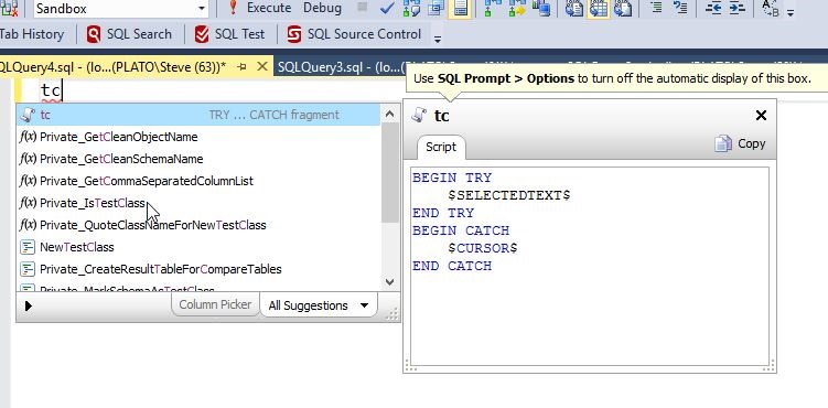 One of the things I think is great is to use the TRY..CATCH structure. I don’t do it enough, but I want to do this more, and make it smooth. SQL Prompt includes a tc snippet, which gives me this code when I type t-c-TAB.