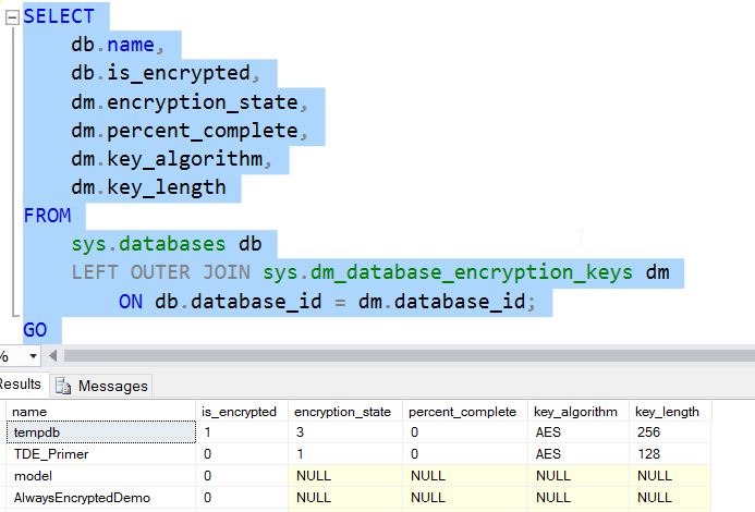 Let’s assume I have an encrypted TDE database. If I run a query, I can see the status as 3, which is encrypted.