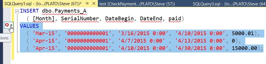 INSERT dbo.Payments_A ( [Month], SerialNumber, DateBegin, DateEnd, paid ) VALUES ( 'Mar-15', '0000000000001', '3/16/2015 0:00', '4/10/2015 0:00', 5000.01 ), ( 'Apr-15', '0000000000001', '4/7/2015 0:00', '4/13/2015 0:00', 0 ), ( 'Apr-15', '0000000000001', '4/10/2015 0:00', '4/30/2015 0:00', 15000.00 );