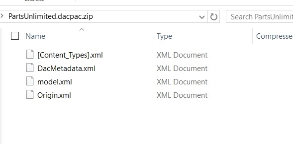 In fact, the .DACPAC is a zip file. If I rename one of them, I can open is like any other zip file. Here’s one I’ve added a .zip to the end of and opened in Windows Explorer. There are a few files in here.