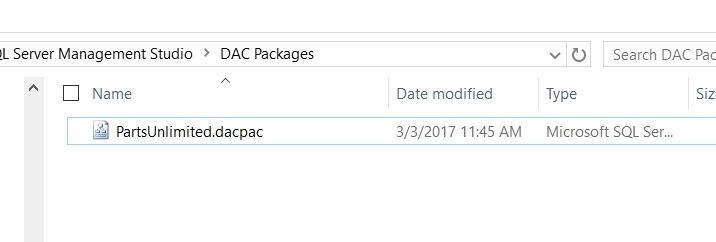 If I go to the file location, I’ll see my DACPAC in the filesystem. The file is recognized as an SSMS file, and in another post we’ll look at how we unpack this.