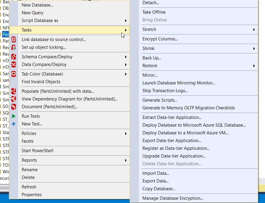 I have a small database, the PartsUnlimited database, from the Microsoft PartsUnlimited demo application. I want to create a BACPAC from this, however, when I right click and select Tasks, there is no “Create BACPAC” option.