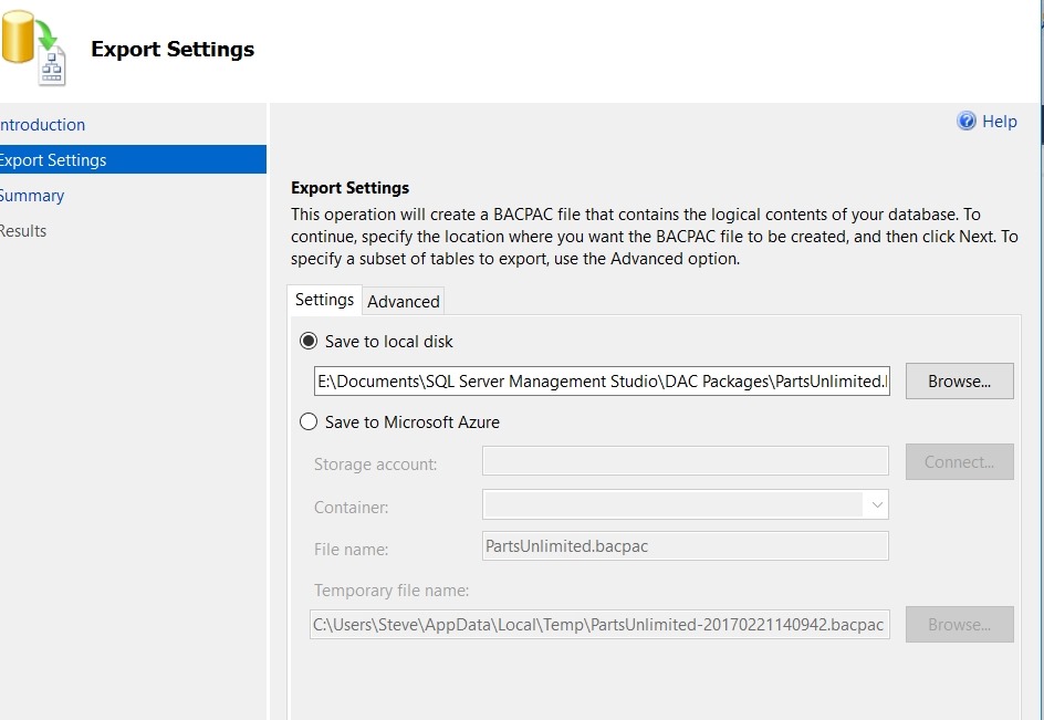 I click next and immediately get prompted for a location in which to save the file. The will include all your data, so choose a location that has sufficient disk space. You have the option to also store this in Azure if needed.