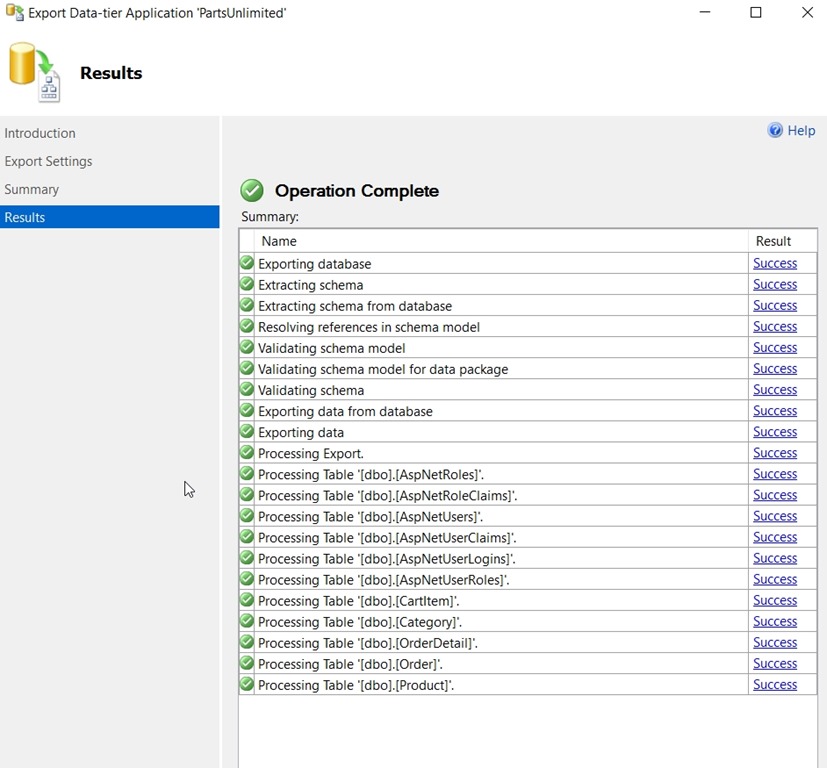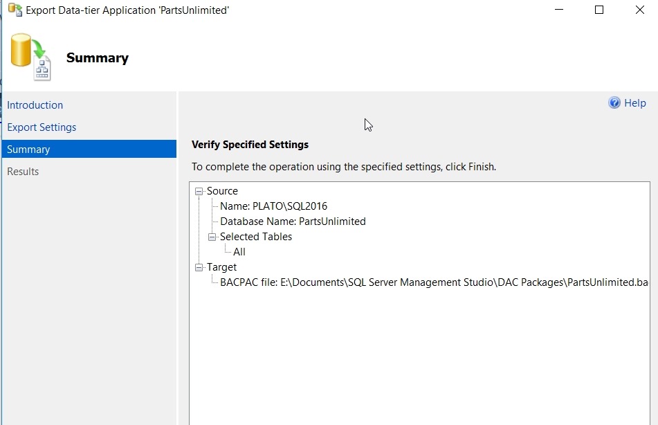 That’s fine, because the “Data Tier Application” is the DAC, and an export includes the data, which creates the BAC part of the process. Let’s choose “Export Data-tier Application”. Once we do that, we get the expected summary wizard screen to start.