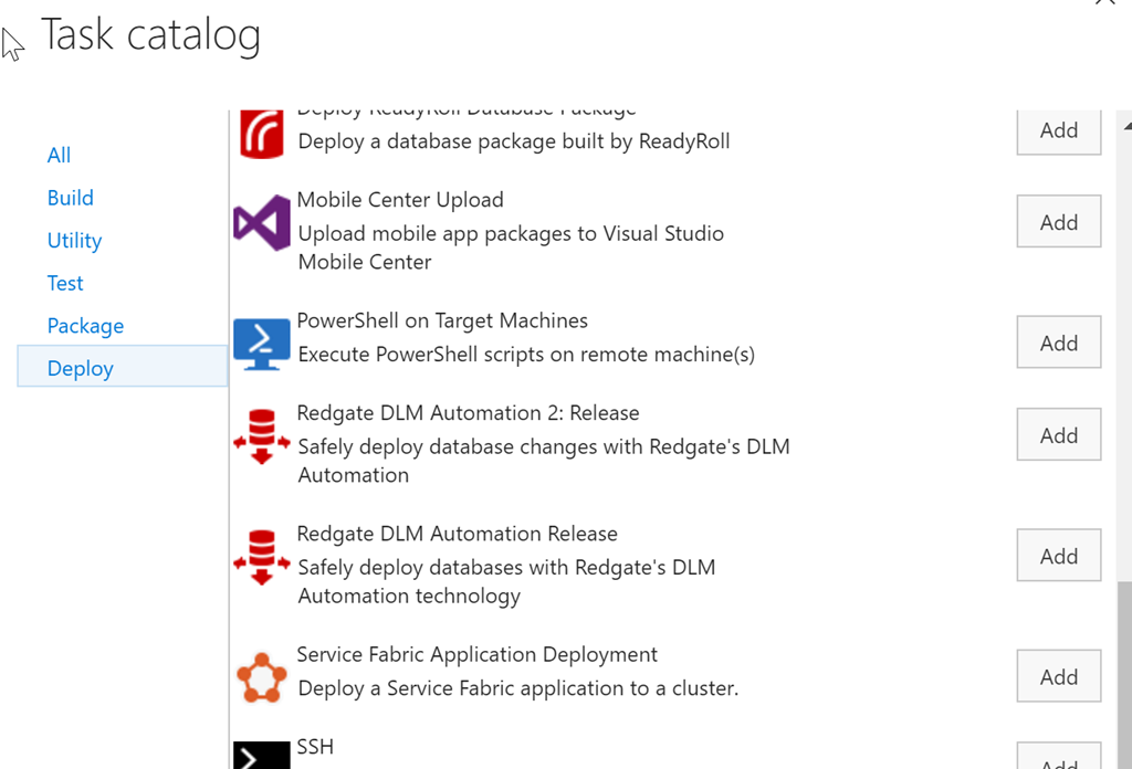 My first step in making this easier is to add a new task. To do that, I click on the “Add tasks” button above. This will default me to the set of tasks for me particular function, in this case, release (deploy). I scroll down to see the v2 tasks.