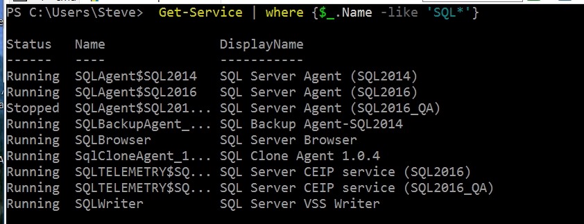 Get-Service | Where {$_.Name –Like ‘SQL*’}