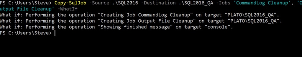 Let’s move just the CommandLog Cleanup and Output File Cleanup jobs over. I can fire up a PowerShell and go from there. I’ll start with the –WhatIf parameter, which lets me test without moving anything.