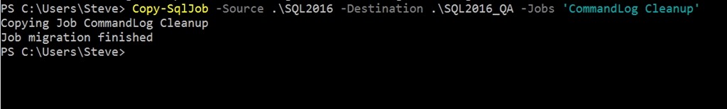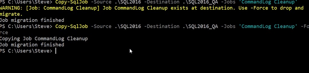 What if I update a job on the source server, and need to ensure the changes get copied to the destination? I can use –Force. If I don’t, I’ll get a message that the job exists. With the Force parameter, the job gets copied.
