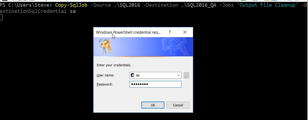 That’s useful, and it works easily across these instances with Windows Auth. What if I need SQL Auth? I can use SourceSqlCredential and DestinationSqlCredential to specify accounts. I can even have this prompt me for the password: