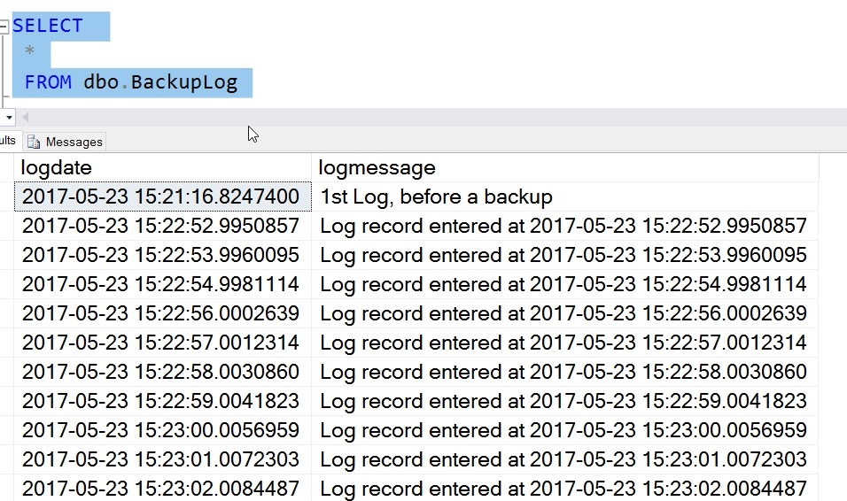 USE master GO RESTORE DATABASE RestoreTime FROM DISK = 'RestoreTime.bak' WITH NORECOVERY, replace GO RESTORE LOG RestoreTime FROM DISK = 'RestoreTime.trn' WITH RECOVERY, STOPAT = '2017-05-23T15:22:57' GO USE RestoreTime GO SELECT * FROM dbo.BackupLog
