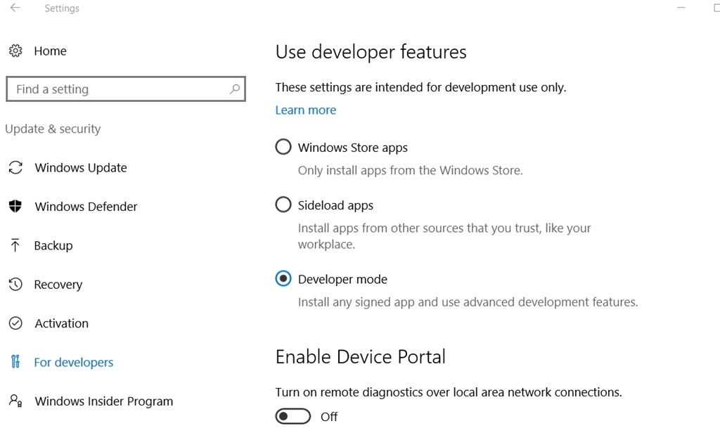 First, enable developer mode. In the W10 Control Panel, type “developer” and you’ll find under Update and Security, a “For Developers” option. I’d enabled “developer mode” before, so that was done for me, but check that box (shown below).