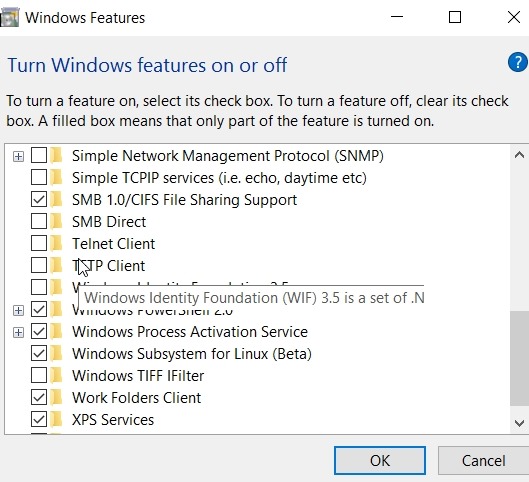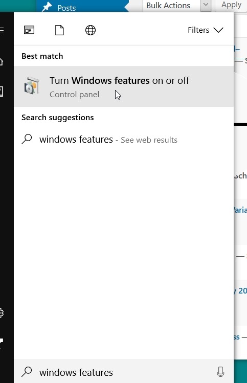 Next, hit the Windows key and type “Windows features”. You’ll get this: