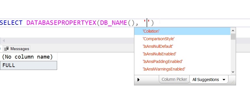 SELECT DATABASEPROPERTYEX(DB_NAME(), ‘Recovery’)