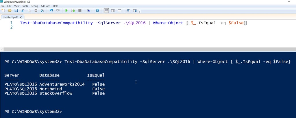 The dbatools project has thought of this, and they have a great cmdlet that can help you build checks of all your databases. The Test-DbaDatabaseCompatibility cmdlet will return the databases and whether they match the server level. You can also get more details if you like. Here’s a quick view. I can run: