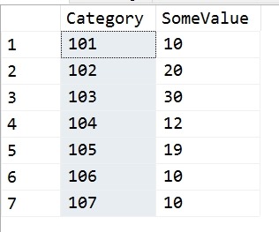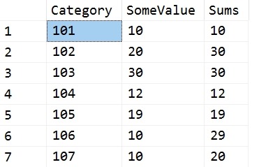 Their goal was to run through these values, in Category order, and whenever the running total sum of SomeValue exceeded 30, reset the sum. Their requirement was that this could only be a single value or two values, which boxes in the problem nicely. In other words, they wanted these results: