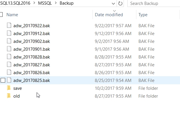 Next, you need to use the extension to decide which files to remove. That means you might need to have separate calls for .bak and .trn (and .dff), or just remove all old files. The choice depends on what your requirements may be.