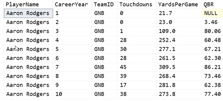 ROLLUP is used to provide additional totals for your aggregates while using GROUP BY. Here’s a little example. I’ve got some data for American Football quaterbacks. In this case, I’ve extracted some stats for a few noteworthy players today. Here’s a sample: