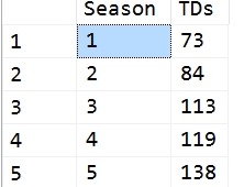 I want to aggregate some data together. For example, let’s say that we want to look at the total touchdowns scored per year by these players in their first 5 years. That’s a simple query: