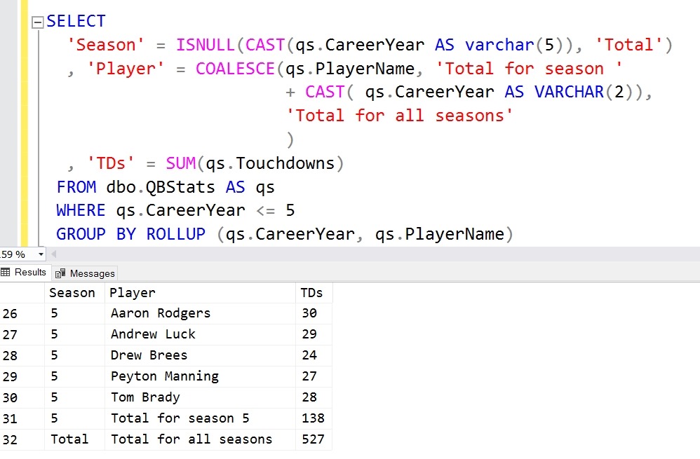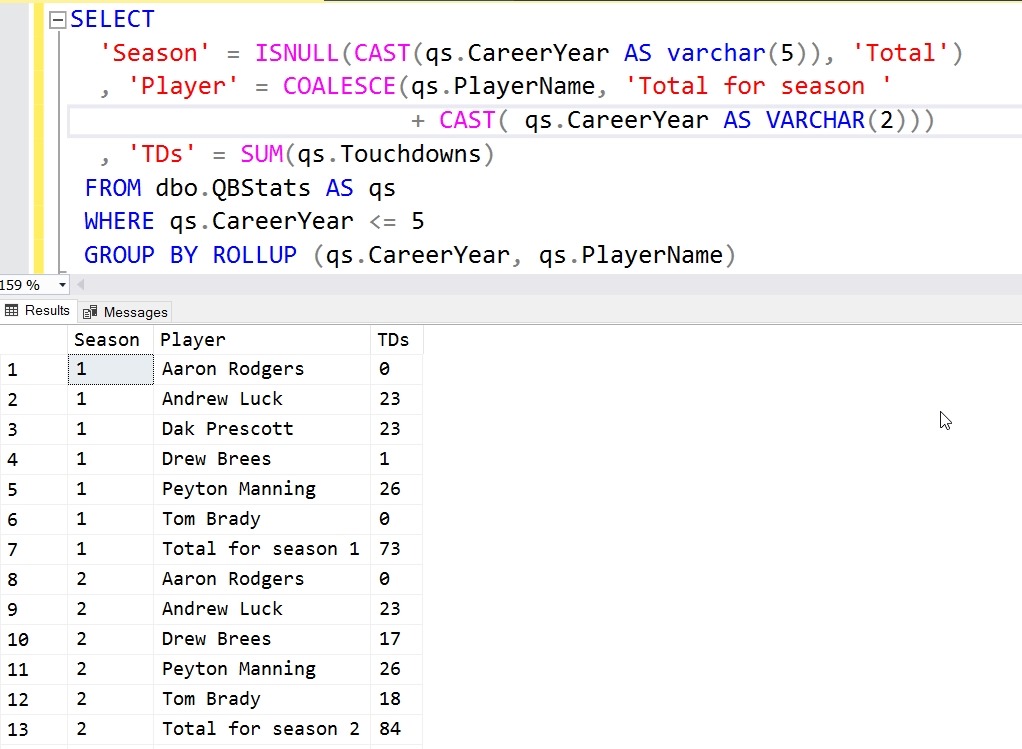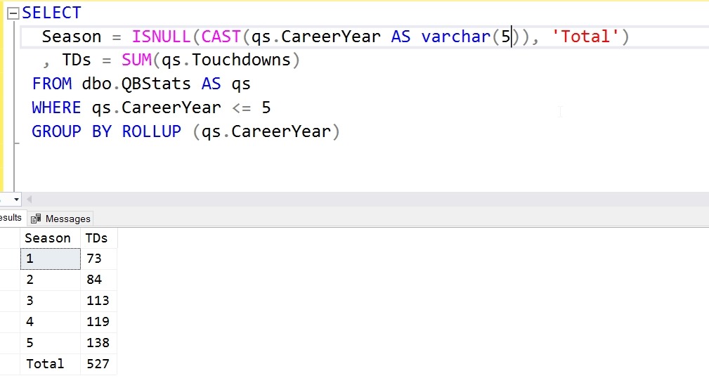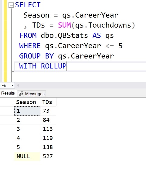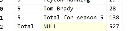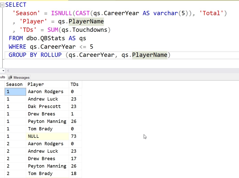 However, when I look at this, I don’t have a total across all years. In my set, there are players that have played up to 18 seasons, and I want to know the aggregate number of TDs. I can get that by adding WITH ROLLUP. This is added