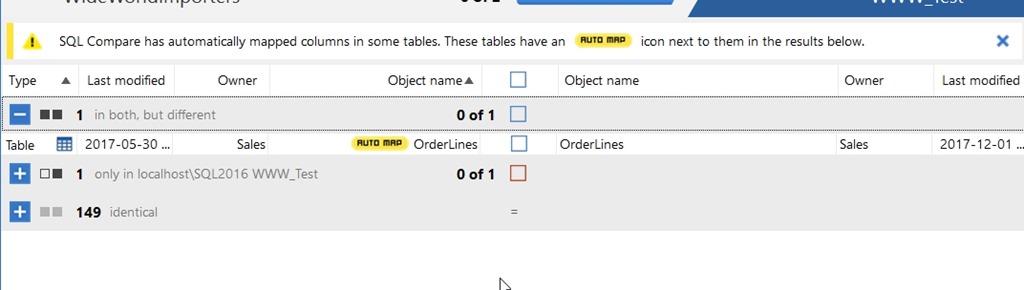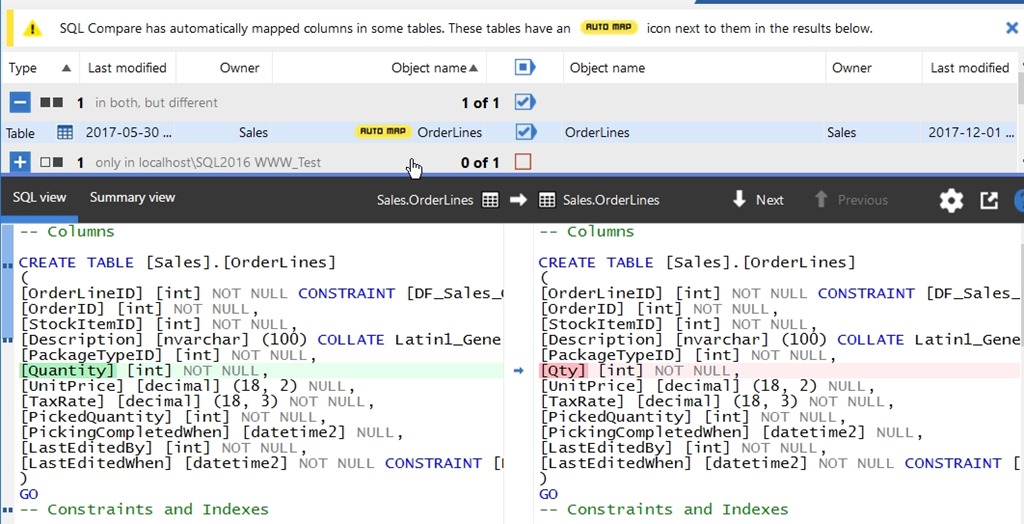 This is a feature in SQL Compare that tries to make your development effort a little quicker and easier. As you can see in the image below, there’s a note at the top of the comparison, and then an indicator for the actual object.