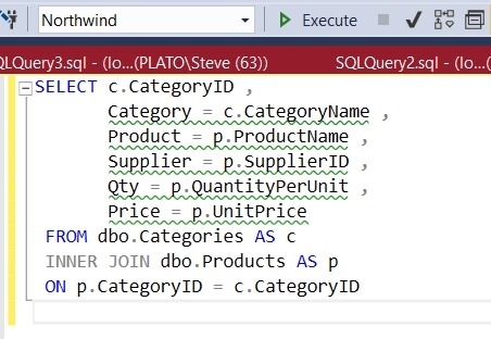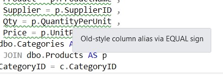 As you can see, there are green squiggly lines under some code. These are static Code Analysis warnings from SQL Prompt. If I put my cursor on the line, I’ll see the warning about the old style column alias: