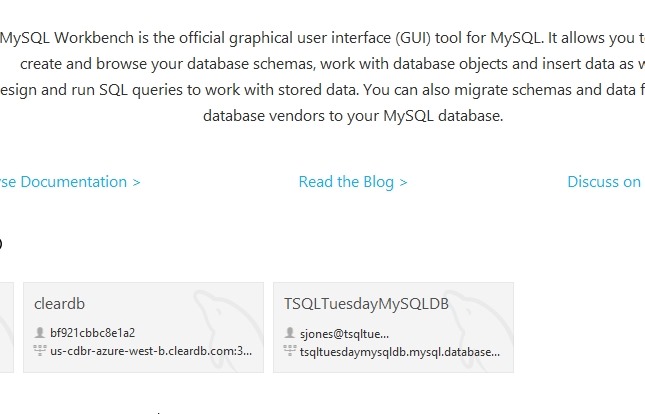 I have MySQL Workbench, so I started that up. I saw a note that this contained a migration wizard. I first created a MySQL database in Azure, which is really simple. Then I created two connections from MySQL Workbench. One to the existing database and one to my new one.