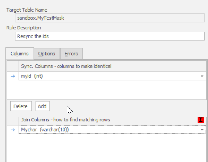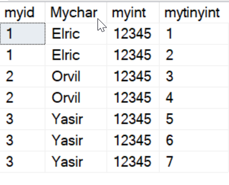 We’re partway there, but I don’t have grouping. Elric has two different values for myid, which is wrong. Let’s fix that. Just as in the previous post, we’ll now add a Table Internal Sync rule. We configure this in reverse of the previous article. Now we use the new, changed names in mychar as the group column and myid as the column to sync across rows.