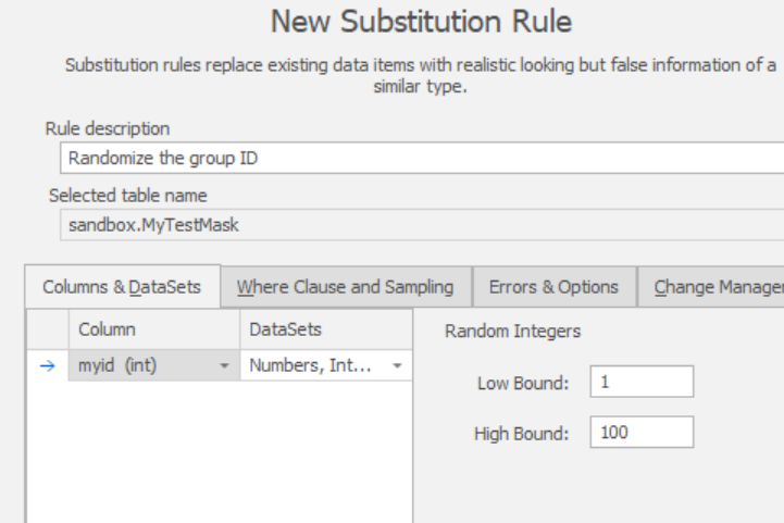 I want to add a new substitution rule that will mix up my myid values. I add the rule and configure the correct column. In this case I limit the boundaries of my random numbers to 1-100, but I could choose any value.