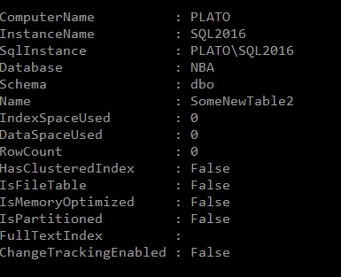 My first experiment was to run Get-DbaTable. This takes an instance and database as parameters and returns a set of table objects. I get space and size information and some metadata. As a short look, here’s one table.