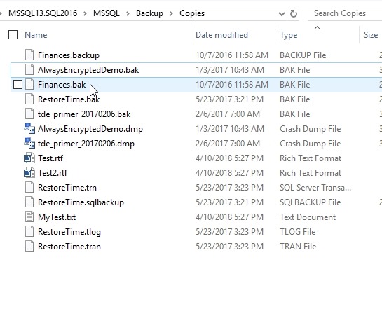 For testing, I copied some backups and then changed some extensions. As you can see, my test folder has SQL backups with various extensions I’ve encountered as well as a few text documents.