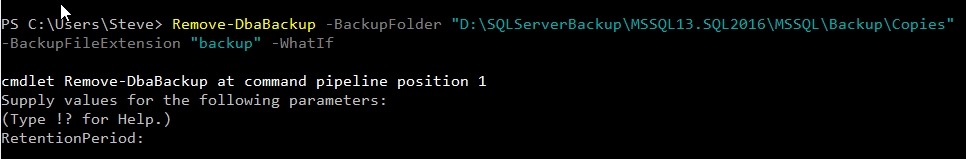 If I run Remove-DbaBackup with some options, I’ll see what will happen with the –WhatIf parameter. I see plenty of files being marked for deletion as long as I have the right extension.