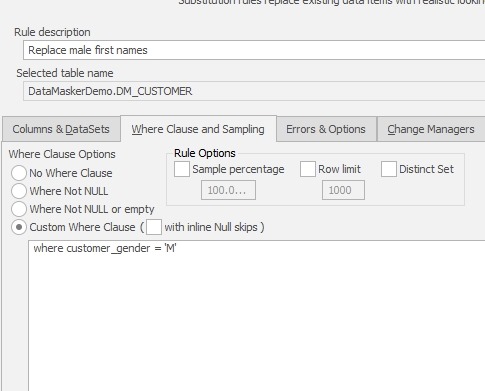 I could also use the WHERE Clause and Sampling tab to limit the replacements. The default it to replace rows where the value is NOT NULL or empty. I won’t bother and I’ll just create this rule.