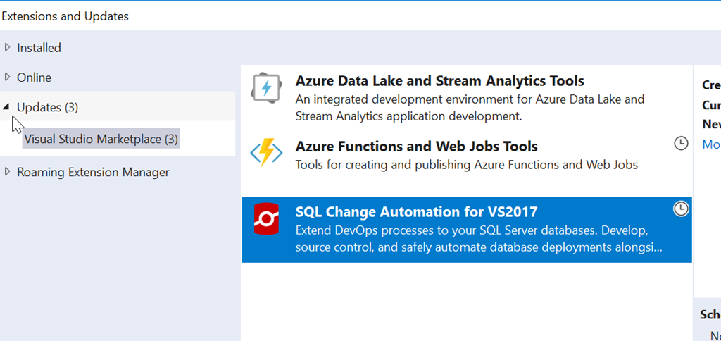 I selected this for upgrade, which replaces my ReadyRoll installation. Once I did this, it downloaded and I had to exit Visual Studio. That triggers the install.