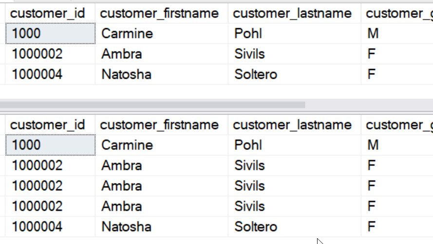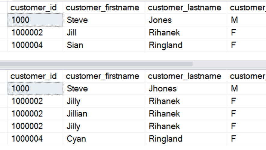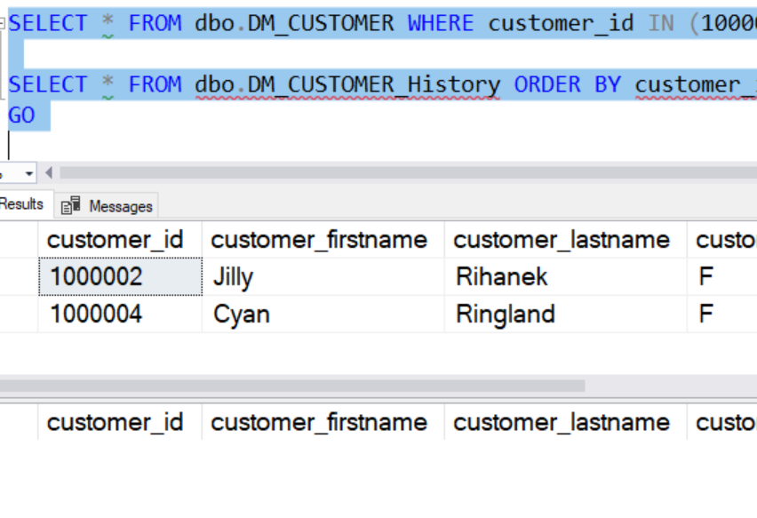 As you can see, the dbo.dm_customer (top) table and the dbo.dm_customer_history table (bottom) are synchronized. The multiple values I had for different versions of customer 1000002 are now all the same. I’ve lost history, but if this were sensitive information, that works out. I could have used random values instead for the history table, but here I can see linkages if I’m checking for similar data.