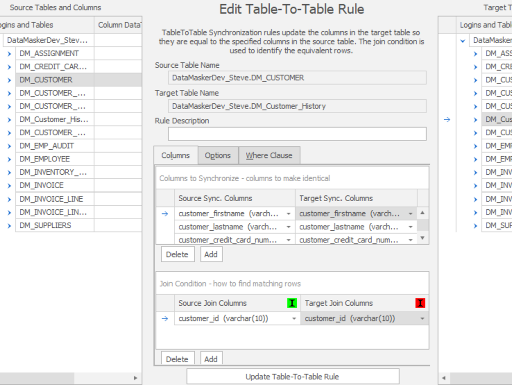 Once this is complete, I now need a Table-Table sync rule to ensure data in one table matches the other. When I create the rule, I need to have a way to join the two tables together. In this case, I use the customer_id column.