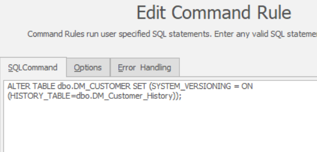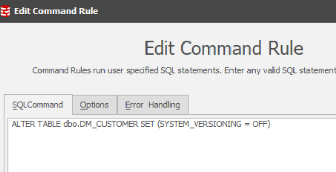 To change this, I need to do a few things. First, I need a Command rule to disable system versioning. This is the way I disconnect the tables so that I can update data.