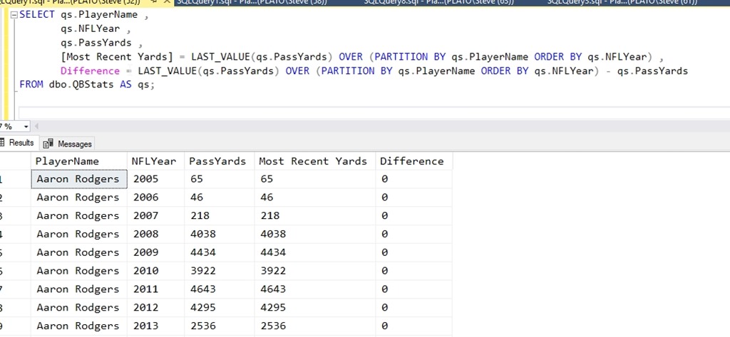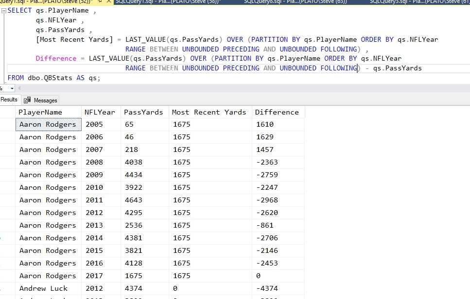 It seems as though in every row, I’m getting the current row as the last value, not the last value of the partition. My partition is by player, so I should only have a window for each player. In this case, I should have the years 2005-2017 for Aaron Rodgers. My ordering is by year, so the last value should be 1675.