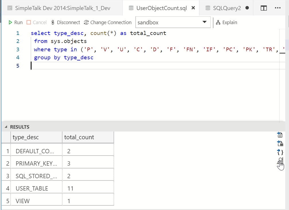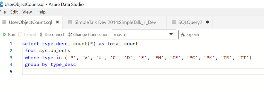 I read Carlos Robles blog on creating an Azure Data Studio (ADS) insight widget and decided to try this for myself. I decided to try and get a list of object types and a count of each. Following instructions, here’s what I did.