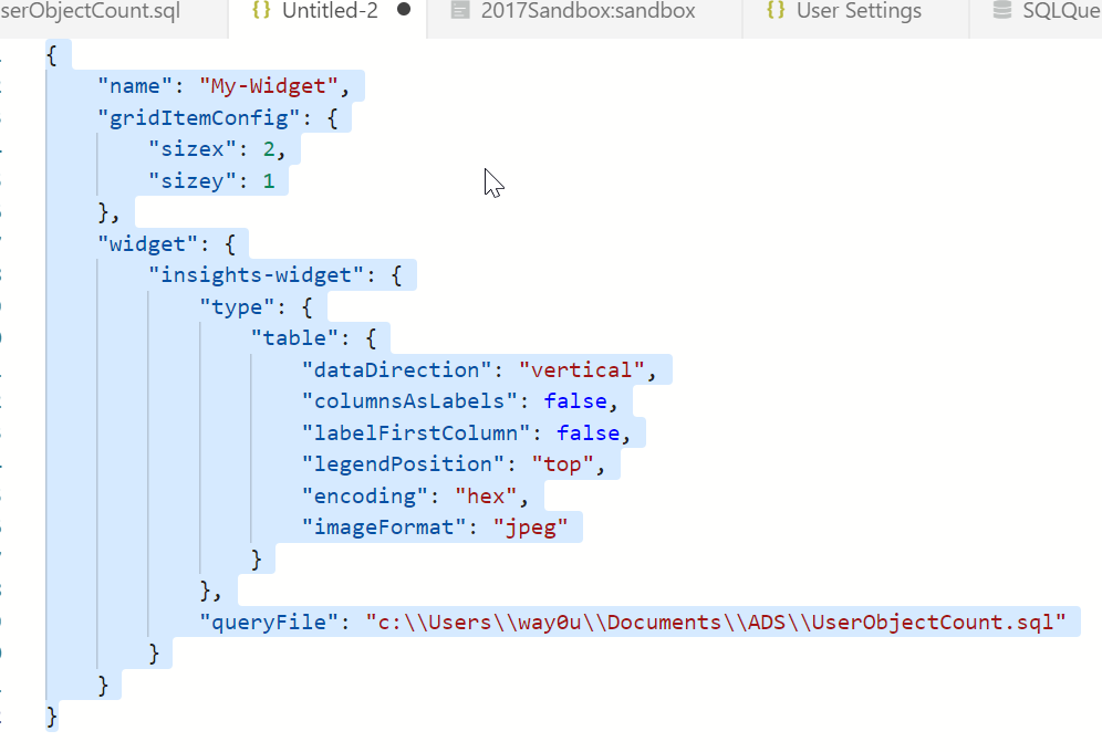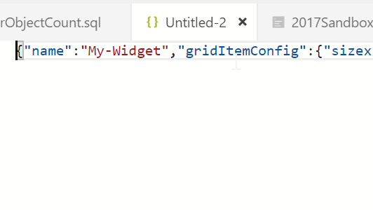Once I’ve done this, I want to modify some code. I don’t love the search box, so I’ll delete that json widget. Then I paste in my widget code. Be sure you put this in the right place, with a comma between the widgets braces. I changed the name from “my-widget” to “User Object Count”.
