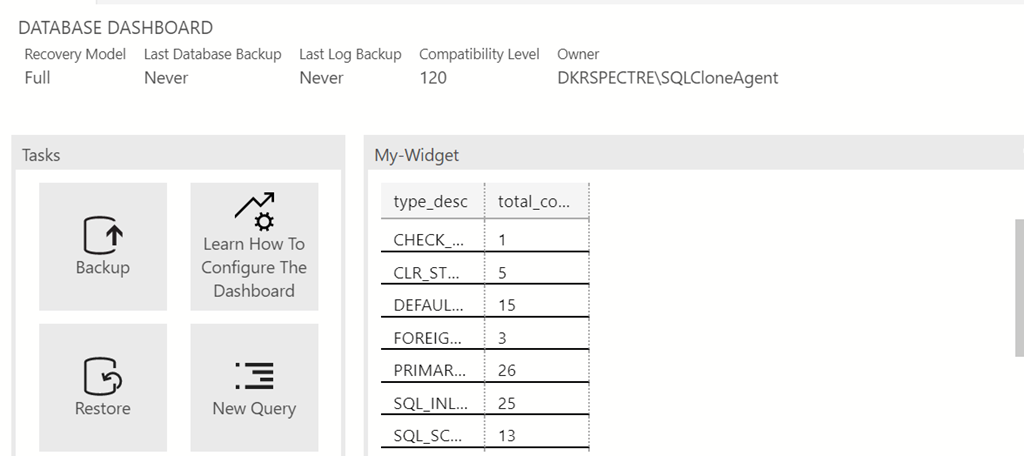 Pretty easy to get a query to appear on your dashboard as a chart if you want to get some insights. Any query could be used, with the results returned when you open the server connection. You can also leave the dashboard open and refresh it when convenient.