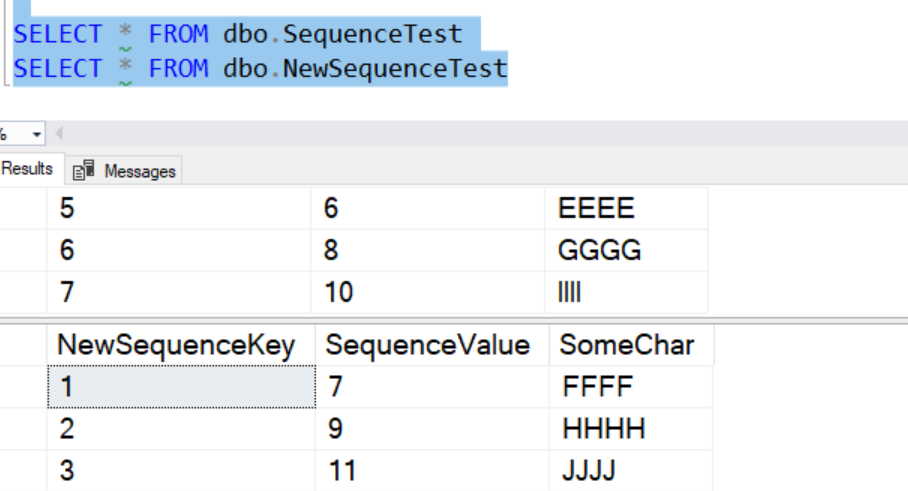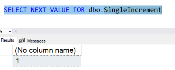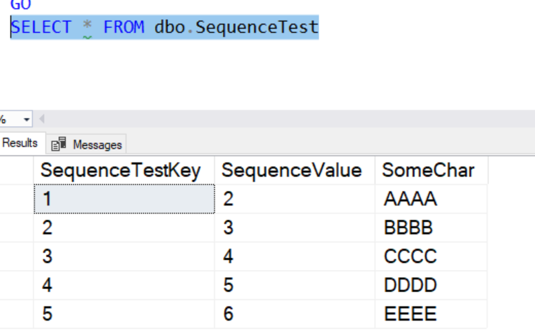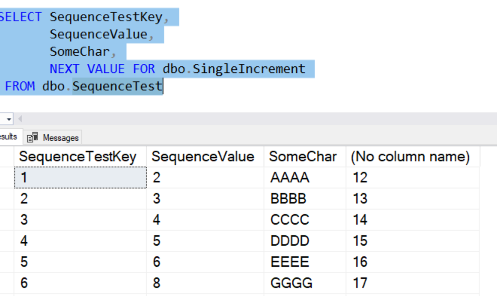 INSERT dbo.NewSequenceTest VALUES (NEXT VALUE FOR dbo.SingleIncrement, 'FFFF')