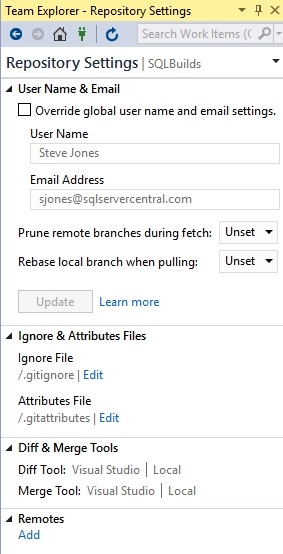 When I created this project, I used a git repo as the default from Visual Studio. However, as you can see, I didn’t add any remotes.