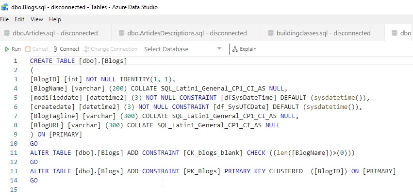 The contents of the dbo.Blogs.sql file are shown here in Azure Data Studio.