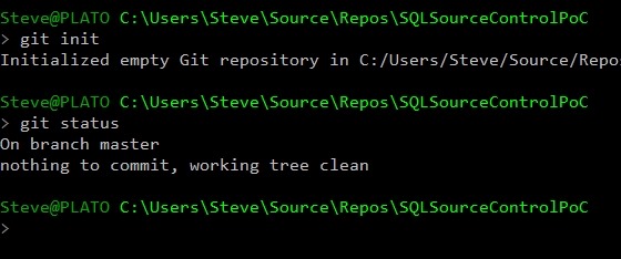 On Windows machines, under your use account, you have a Source, and then a Repos set of folders. I’ll change to those in the command line. I’ll then create a folder, called “SQLSourceControlPoC”. I find it easy to keep the folder name the same as my project, which in this case is the database. I’ll create a folder under this to store my actual code.